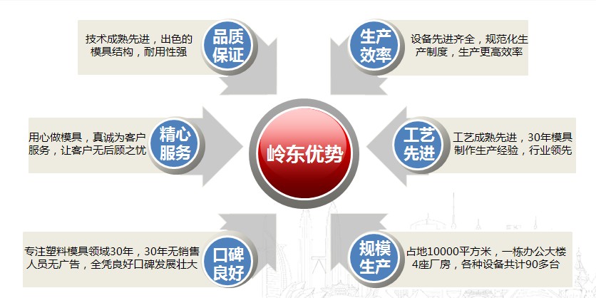 揭陽嶺東模具有限公司創(chuàng)建于1986年,歷時20多年穩(wěn)健發(fā)展,廠區(qū)占地面積10000平方米,工人技術(shù)人員近百人,是一個技術(shù)力量雄厚、設(shè)備先進、工人經(jīng)驗豐富的大型民營塑料模具制造企業(yè)。公司擁有寬敞明亮的現(xiàn)代化標準廠房及各種先進的加工設(shè)備,其中日本哈馬伊加工中心、臺灣進口加工中心、大型龍門銑床及各種立式、臥式數(shù)控銑床共31臺,數(shù)控車床15臺,數(shù)控線切割機、數(shù)控電火花成型機、鉆床、磨床及鋸床共計32臺,大小型起重機、航車15臺。自主研發(fā)模具生產(chǎn)工藝及模具成型技術(shù),特別對于制造加工大中型日用塑料模具具有極大優(yōu)勢。